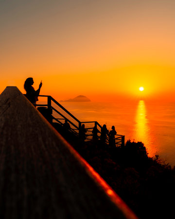 A vertical shot of the silhouettes of people taking pictures of the sea at sunset