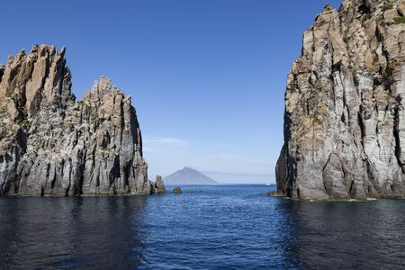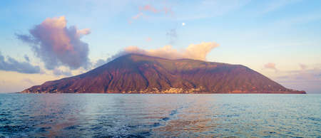 Stromboli volcanic island in Lipari, viewed from the ocean, Sicily, Italy.