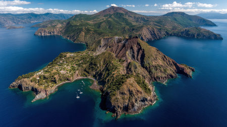 Breathtaking aerial view of rugged island landscape featuring steep cliffs, lush greenery, and clear blue waters. volcanic mountain background adds to dramatic scenery, creating serene yet