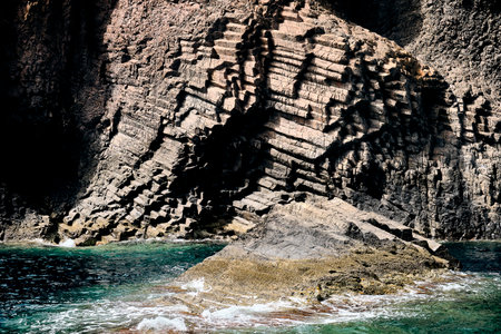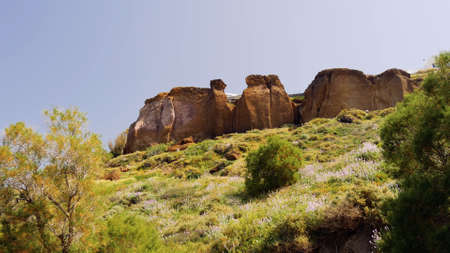 The volcanic rock formations along the sea strip on Imbros island of Gökçeada are called Cheese cliffs. Canakkale, Turkey.