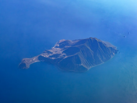 The Filicudi island aerial view from airplane at sunset, Aeolian Islands, Sicily, Italy