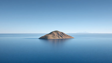 A picturesque view of a remote island rising from calm waters beneath a clear blue sky. This image embodies tranquility, serenity, and the beauty of nature.