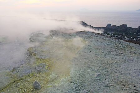 Gray Hydrogen Volcano and Volcano Craters on Vulcano Island, Lipari, Italy. Sunset, Gas, Poisonous Pairs, Evaporation.