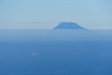 Distant Stromboli volcano with blue sea and sky on a hazy sunny day seen from Palmi, Calabria, Italy