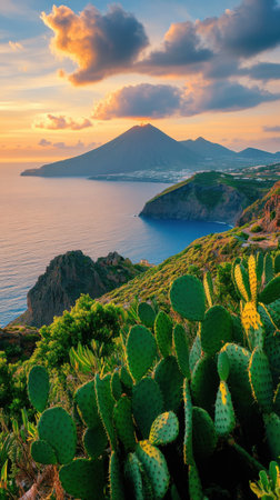 A breathtaking panorama of the Aeolian Islands showcases Stromboli's active volcano, surrounded by lush vegetation and a vibrant sunset over the Mediterranean Sea.