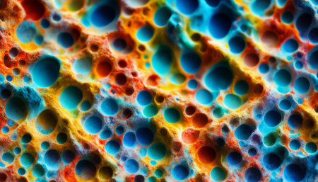 Fantastic structure of colorful bubbles. Chaotic motion. Abstract colorful paint. Top view. Movement of bubbles in the liquid. Oil surface multicolored background. Macro