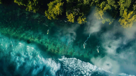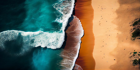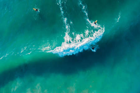 Generative AI : Aerial view of people with a surfboard in the Ocean waters Australia