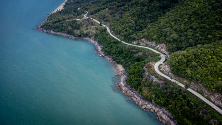 Ocean Road and sand beach in Khanom Sichon Road at Khao Phlai Dam, Nakorn Sri Thammarat province, Thailand. Shot by Drone Aerial View