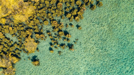 aerial drone view from the top with azure sea water with a seaweed, vacation travel concept