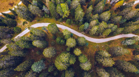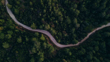Scenic aerial view of a winding trekking path in a forest. Trekking path in the forest from above, drone view. Aerial top view of a trail in the middle of a forest. Aerial view of footpath in forest.