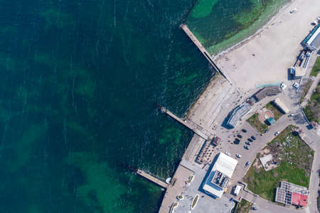 Sandy beach, concrete pier, clear sea water. Helicopter view