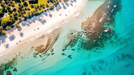 Scenic aerial shot of a sunny beach with white sand surrounded by transparent blue ocean water.