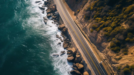 Generative AI : Aerial view of a railroad along the beach with ocean waves rolling on the shoreline