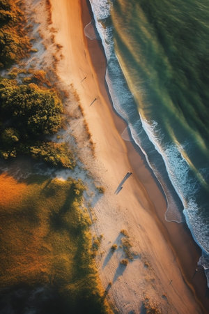 Generative AI : Aerial view of a car driving on the beach Bribie Island Queensland Australia Top down perspective
