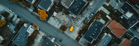 Aerial view of a neighborhood after a devastating earthquake showing cracked roads and damaged houses, highlighting the impact of natural disasters on urban areas