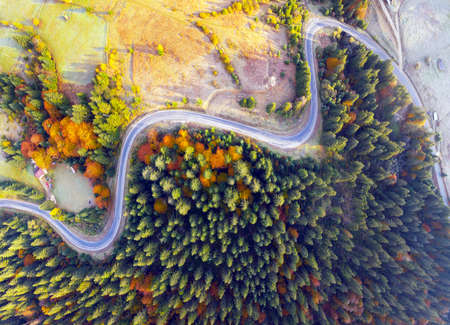 Aerial photo of beautiful mountain Krivopol pass Carpathians, Ukraine. Drone filmed an alpine landscape with coniferous and beech forests, houses, around a winding serpentine road