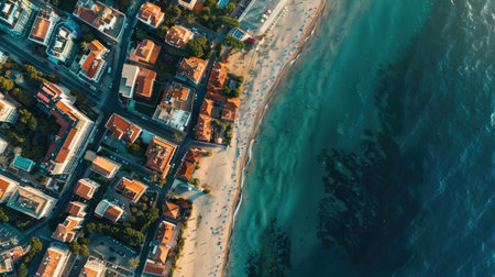 Holiday vacation on the sandy beach, sunbathing and swimming in the water aerial drone photo