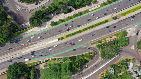 Top down view of road traffic in the heart of Jakarta business district along the Sudirman avenue in Indonesia capital city in Southeast Asia