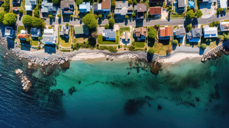 An aerial view of a city by the waterfront showcasing urban design, architectural buildings, and natural landscapes including condominiums, houses, and art installations AIG50