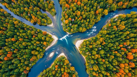 An aerial perspective reveals a natural landscape where a river branches out into a delta, flowing through a dense forest ablaze with autumn colors. The vibrant hues of orange, yellow, and green from the changing leaves create a striking contrast with the deep blue water. The intricate patterns of the branching waterways and the textured forest canopy offer a visually view of nature's beauty during the fall season.