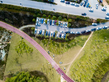 Aerial view of a large number of cars of different brands standing in a parking lot near the shopping center in a parking divided by white dividing strips and sidewalks