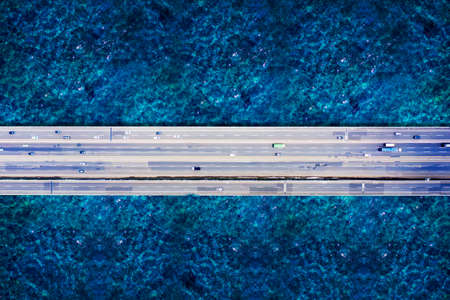 Top down view of beautiful elevated road and tollway surrounded turquoise water. Shot at the sea