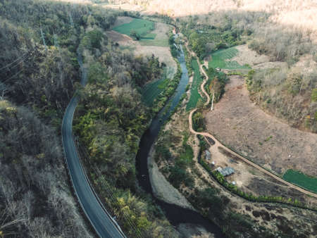 Top view of countryside road passing through the green forrest and mountain
