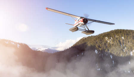 Seaplane flying over Canadian Mountain Nature Landscape. 3d Rendering Airplane Adventure Concept. Background from Grouse Mnt, North Vancouver, British Columbia, Canada.