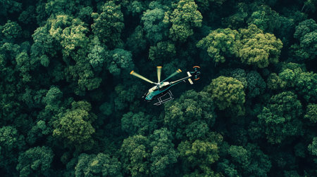 Aerial view of helicopter flying over green forest. Drone flying over forest.