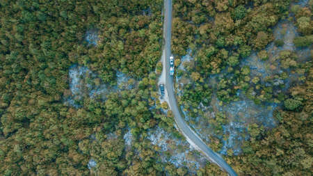 Aerial top view of curvy mountain road goingthroughthe pine forest.