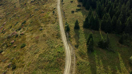 Aerial rocky woods road view among green spruce trees growing grassy hills. Peaceful mountain landscape charming beautiful sequoia forest national park panorama. Nature path background concept