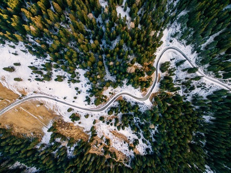 Aerial view of snowy forest with a road. Captured from above with a drone. Dolomites - Italy