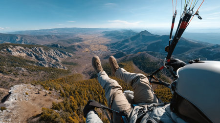 Experience the thrill of paragliding with this breathtaking aerial view over a stunning mountainous landscape, showcasing nature's beauty and freedom.