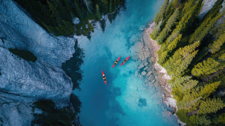 Rowing boats glide smoothly across shimmering turquoise water, creating beautiful contrast with deep blue hues. scene captures essence of teamwork and adventure