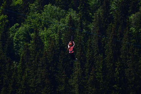 A girl of unrecognizable appearance descends a tightrope on a zipline at a high altitude. Attraction on the background of mountains covered with forest