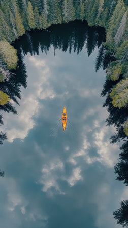 A kayaker navigates calmly on serene waters reflecting a sky filled with clouds, framed by towering trees on either side, creating a peaceful outdoor atmosphere.