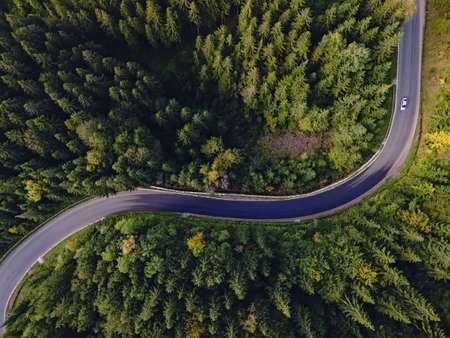 Aerial view of curvy road passing through the green forest, top view