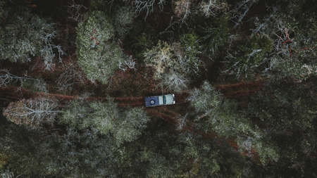 An aerial shot of a car driving in a forest surrounded by tall trees