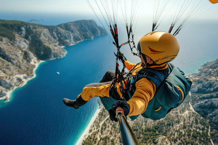 A person paraglides high above a beautiful coastline, enjoying the thrill and breathtaking views.