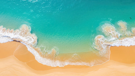 Aerial view of turquoise waves gently crashing onto a sandy beach. The oceans clear water, mixed with white foam, creates a tranquil