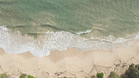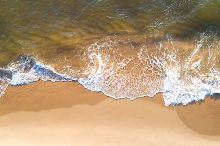 Beach Sand Sea Shore and waves white foamy summer sunny day background.Amazing beach top down view overhead seaside nature background