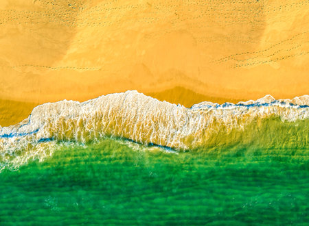 Green sea waves breaking on a golden sand shore. Top view directly above, natural background