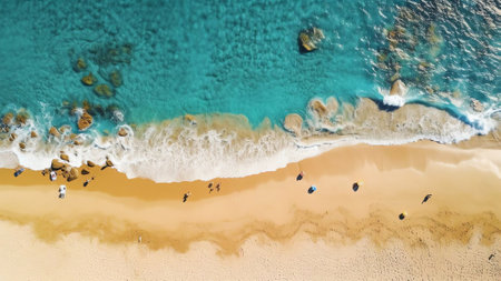 An aerial view of a sandy beach with people walking on it. The ocean waves are crashing on the shore, creating white foam and turquoise water.
