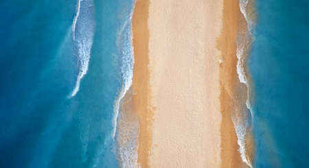 Aerial view sandy beach and waves Beautiful tropical sea in the morning summer season image by Aerial view drone shot, high angle view Top down sea waves
