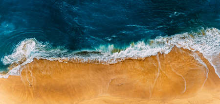 Top view of a deserted beach. The Portuguese coast of the Atlantic Ocean. Aerial drone photo of ocean waves reaching shore.