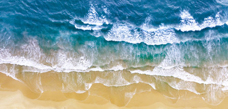 This image captures an aerial perspective of dynamic ocean waves crashing onto a pristine sandy beach, showcasing clear, rhythmic patterns and vivid colors that evoke a sense of tranquility and natural beauty encapsulated within the seascape.