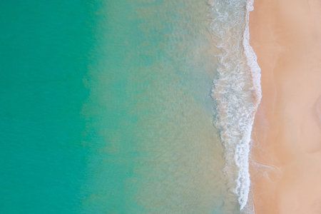 Aerial view of turquoise ocean wave reaching the coastline. Beautiful tropical beach from top view. Andaman sea in Thailand. Summer holiday vacation concept