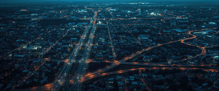 Aerial View of a Sprawling Cityscape at Night with Illuminated Streets. Concept of Urban Metropolitan Area, Nightlife, City Lights, and Urban Development.