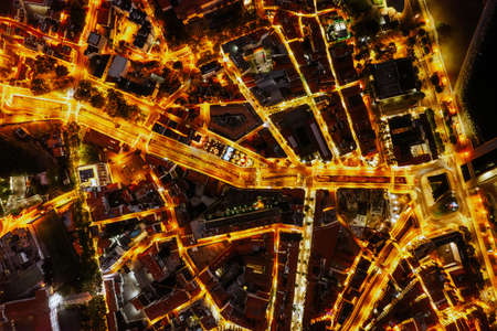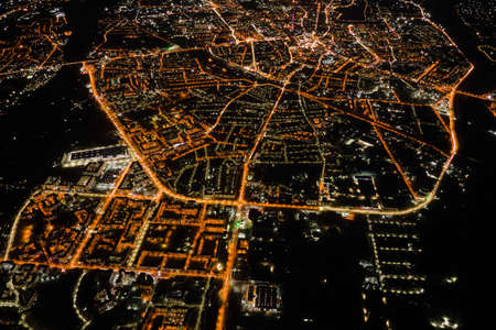 Aerial view from airplane window of buildings and bright illuminated streets in city residential area at night. Dark urban landscape at high altitude