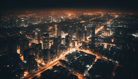 Nighttime cityscape: Skyscrapers illuminate urban skyline, a futuristic built structure generated by artificial intelligence